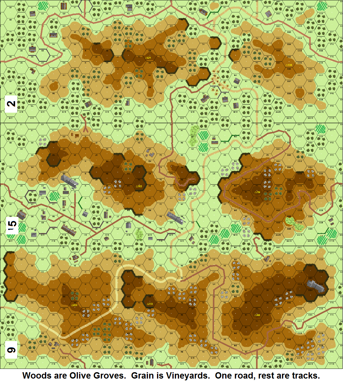 On Crete, once again the British forces had suffered defeat and were in retreat, streaming towards the beaches at Sfakia and evacuation by the Royal Navy. The pursuing German mountain troops were pressing hard, and had to be checked. The commandos of Layforce were ordered to stop and act as a rearguard, even though too lightly equipped to operate as regular infantry. They made a stand where the only road over the White Mountains passed through a narrow valley thickly covered in olive groves. They had been promised armor support but the Germans arrived first. .Attacker: German (Bataillon II, Gebirgsjäger Regiment 85)