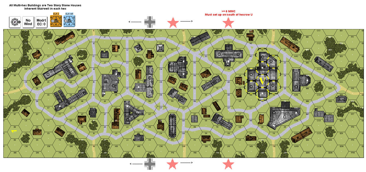 | Misc Rules: | Multi-hex bldgs: Two Story Houses, X4 is FB (B23.9). A: AE (H1.22) |