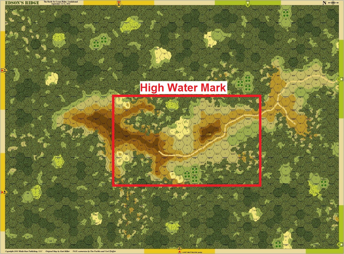 The Japanese under Colonel Kawaguchi were pressing hard to take the Lunga Ridge from Edson's Raiders. The Marines bent, but had not yet broken, and were making a last stand on the final defensive obstacle between the Japanese and Henderson Field. Outnumbered, the Raiders had but one advantage - artillery. As shell after shell slammed into the Japanese staging areas, they elect to attack and fight rather than die staging for an assault. With a fateful "BANZAI!" they charge up the hill one more time...Attacker: Japanese (7th Company, II Battalion, 4th Regiment/5th Company, II Battalion, 4th Regiment)