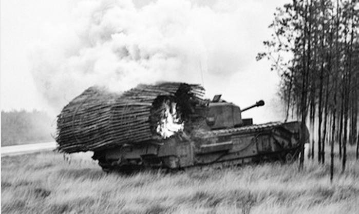 At Hervorst, a village slightly north of Goch that was also part of the Siegfried line, a company of Camerons bumped up against several enormous pillboxes. They had concrete walls 3-feet thick and were cleverly camouflaged under dirt and grass, with only gun slits showing. Each pillbox contained a 150mm gun, which the Camerons needed to silence. Commander Major Donald Callander had an array of armor support available to assist with the assault.Attacker: British (5th Queen's Own Cameron Highlanders, 152nd Brigade, 51st Highland Division/79th Armoured Division)