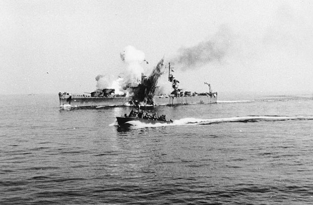 USS Savannah (CL-42) is hit by a German radio-controlled glider on Sept. 11th