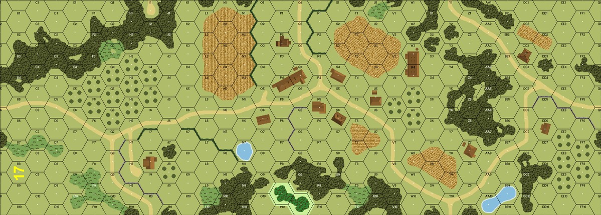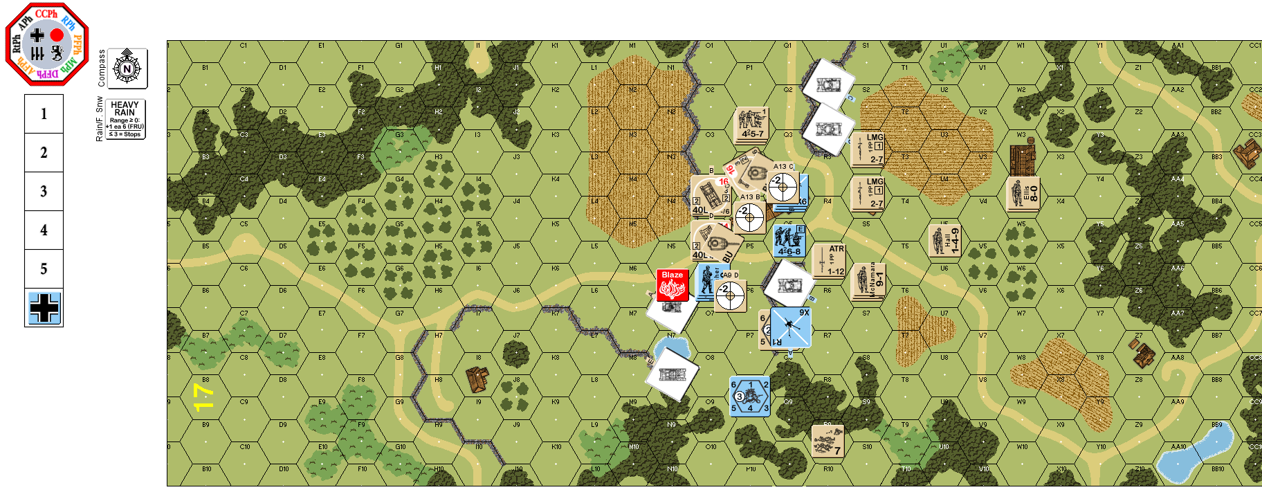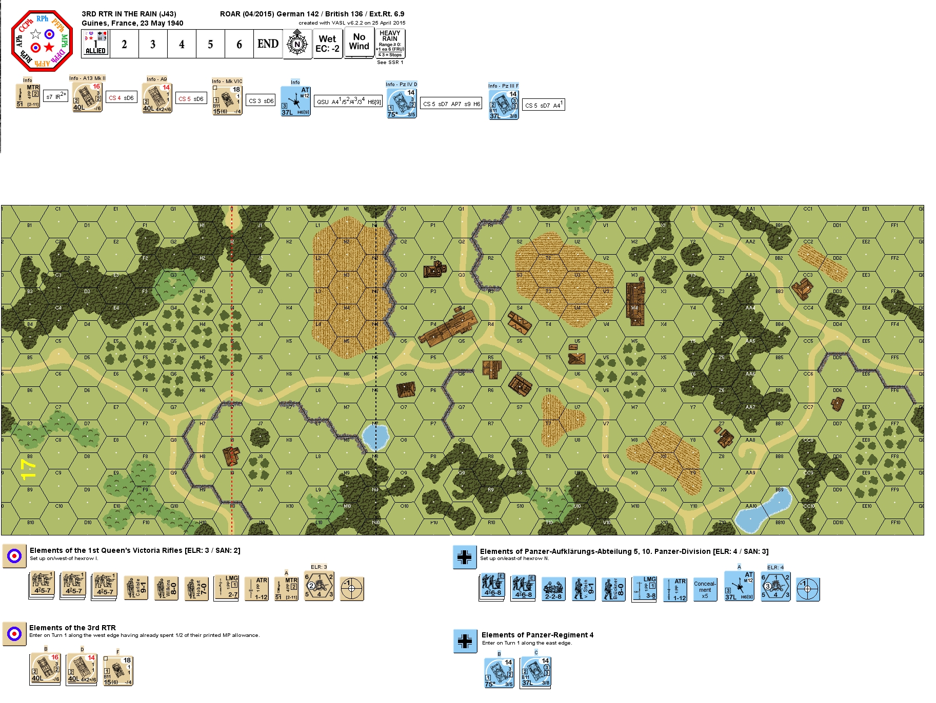 | Misc Rules: | Heavy Rain (E3.51) is falling and will not stop! Hedges: Walls. Bldgs: Wooden. |