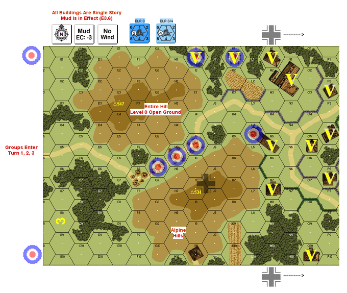 | Misc Rules: | No Hill 547, treat rds as paved for movement purposes only, Mud, Alpine Hills |