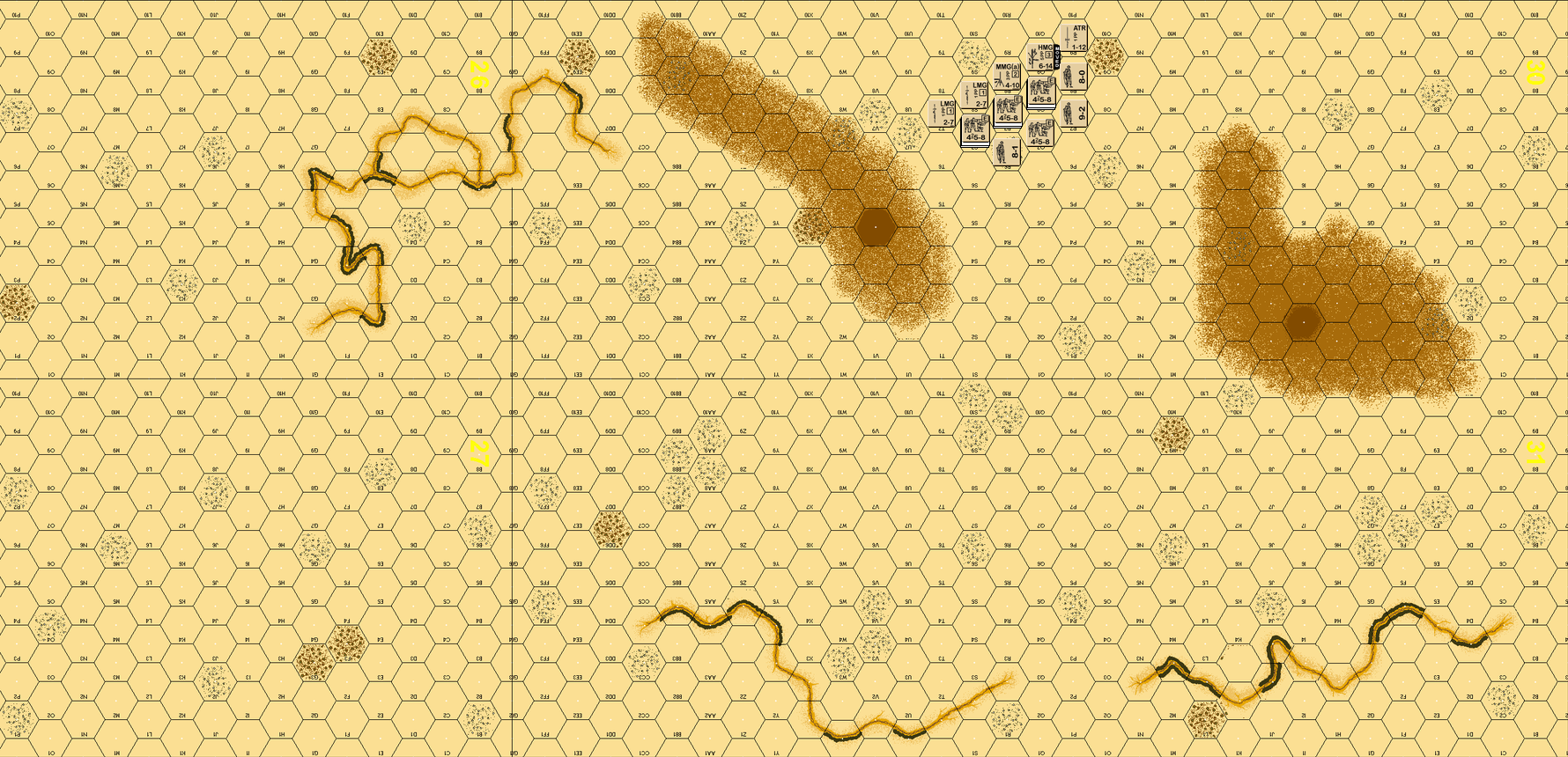 A desert game, but with the F13.1 Broken terrain it became a task of threading the Axis column down a track, through a minefield, and then down a clear path to race along the board edge to victory. Essentially this was a parade along a designated path to exit.