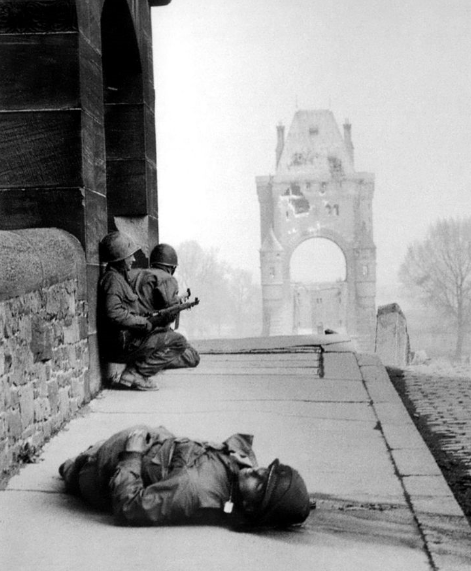 It will never be known who ordered the charge. Perhaps it was Colonel Burnette, who was mortally wounded as his men neared the 100 foot bridge. Perhaps it was simply the sight of Lt. Edwards' tanks edging across the unblown span that drew the men forward. Amidst a shower of shot and shell, a small band of brave GIs, supported by three Shermans, burst across a bridge "faster than they knew how" and then hunkered down to defend the narrow approach. . .Attacker: German (11th Panzer Division)