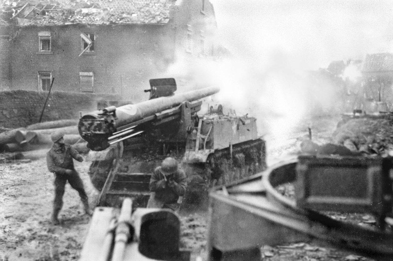The American hand had closed about Aachen. But the city fell slowly. Street by street, then house by house, the GIs squeezed out the Germans. Finally, the Wehrmacht headquarters in the Hotel Quellenhof was in sight. The massive hotel structure proved impervious to direct 75mm fire from supporting Shermans. As the GIs launched their first assault, Colonel Corley called on a self-propelled 155 for direct fire support.Attacker: American (3rd Battalion, 26th Infantry Regiment)