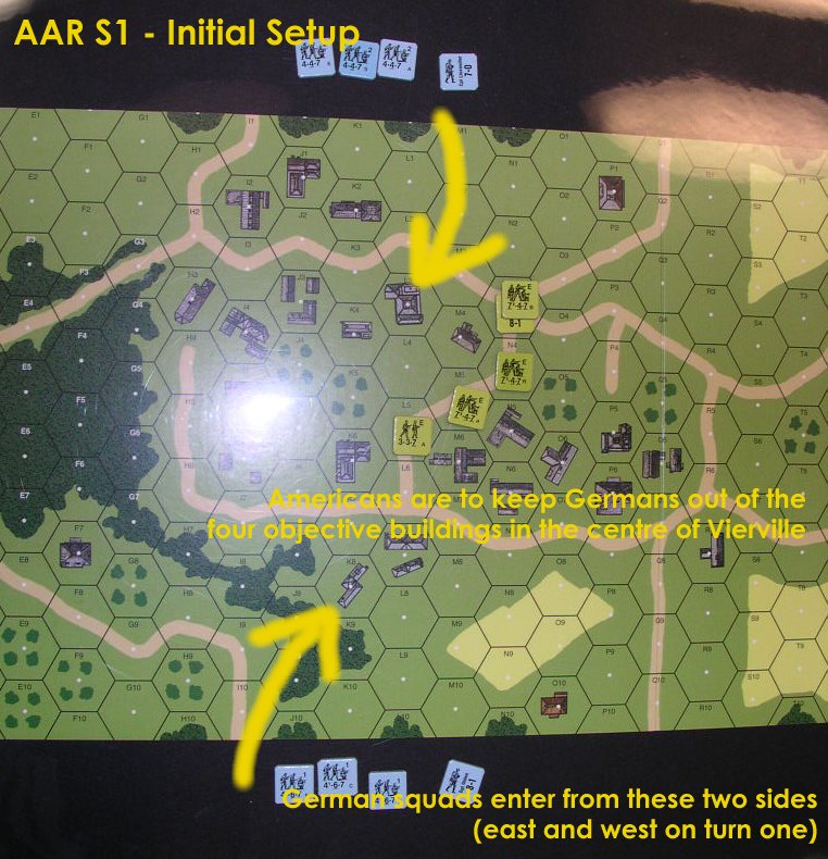 Vierville, which lay a few miles inland from Utah Beach, had been liberated on D-Day. On the morning of June 7, elements of the 2nd Battalion, 506th PIR moved out from Vierville towards St. Come du Mont, leaving Vierville virtually unoccupied. The Germans took this opportunity to launch a series of counterattacks on Vierville in hopes of cutting the road to St. Come du Mont. -- This is a great ASL introductory scenario. It involves using Infantry and Leaders counters, no support weaons and no SSRs.Attacker: German (1058th Grenadier Regiment/919th Grenadier Regiment/6th Fallschirmjäger Regiment)