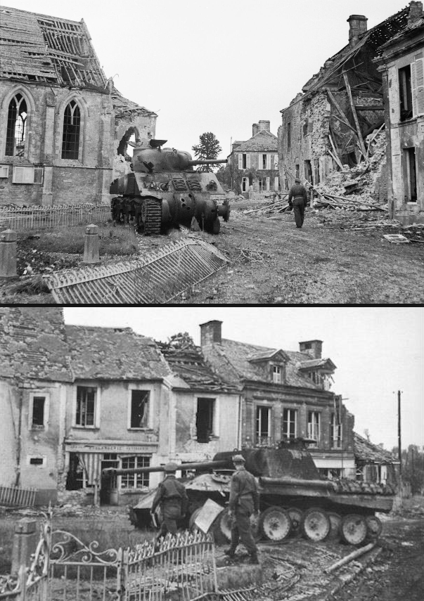 Sherman and Panther tanks knocked out in Lingevres battle