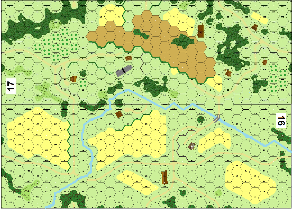 | Misc Rules: | KGP Moderate Mist, Stream deep - vehicles c/n enter. Hedgerow on hill is at Level 1. |