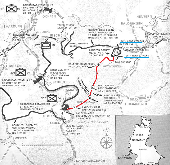 As XX Corps approached Zerf the German resistance stiffened again in their own homeland. The 5th Rangers were ordered to assist in a breakthrough by the U.S. 10th Armored Division by moving behind German lines during the night. After four separate skirmishes, the Rangers were amazed the German command still did not seem to know that they were now in German territory. Reaching the Zerf-Irsch road, the Rangers laid their few mines. Finally realizing the Rangers were behind them, the Germans organized a counterattack. At 1645 hours, elements of the 136th Infantry Regiment attacked the Rangers from the north and south under artillery cover.Attacker: German (136th Infantry Regiment, 2nd Gebirgsjäger Division)