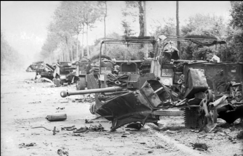 The wreckage of the 1st Rifle Brigade transport column and a 6-pounder anti-tank gun, on the road between Villers-Bocage and Point 213.