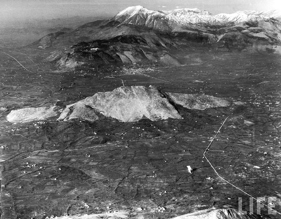 Aerial view looking down on Route 6 which runs past German-held Mt. Porchia (bottom), around Mt. Trocchio (centre) & on into Mt. Cassino (background)