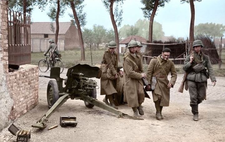 | Captured French soldiers of the 158eme Regiment d'Infanterie (43eme Division d'Infanterie) carry a wounded comrade past a damaged French 25mm Hotchkiss (SAL Mle 34) anti tank gun which was positioned at crossroads in the Belgium village of Thulin. (thulin.png) | Image | hoxson1 | 1507 |