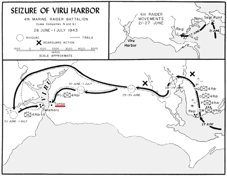 Originally the plans for the capture of Viru Harbor had called for Lt. Brown’s platoon to attack the small village of Tombe on the east side of the harbor as a distraction while the main body under LTC Currin would then attack the village of Tetemara on the west side of the harbor. However, after the discovery of Lt. Brown’s small force on 29 June, Currin decided that the Tombe force should be augmented with a second platoon under Captain Walker. Making a stealthy approach, it turned out that the Japanese at Tombe were apparently unaware of the Marines, eve after being warmed two days previously.Attacker: American (USMC) (Captain Walker's Detachment, P Co., 4th Raider Battalion)