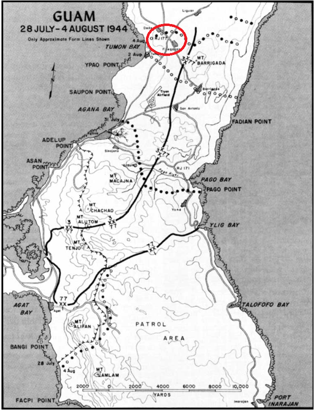 Later in the afternoon after RJ177 was secured, Companies A and C passed through to bivouac near Finegayan. Company B was ordered to occupy RJ177 and was digging in as a convoy of jeeps, tanks and trucks rumbled through the junction. This convoy was an Armored Recon Group based around a company from 3/21 Marines. As the Recon Group sped pass RJ177, and unknown to anyone present, it headed towards the small village of Yigo, THE WRONG WAY! After travelling just over 400 yards from RJ177, the group ran head-on into a Japanese machinegun ambush supported by guns and a tank.Attacker: American (USMC) (Armored Recon Group, 21st Marines)