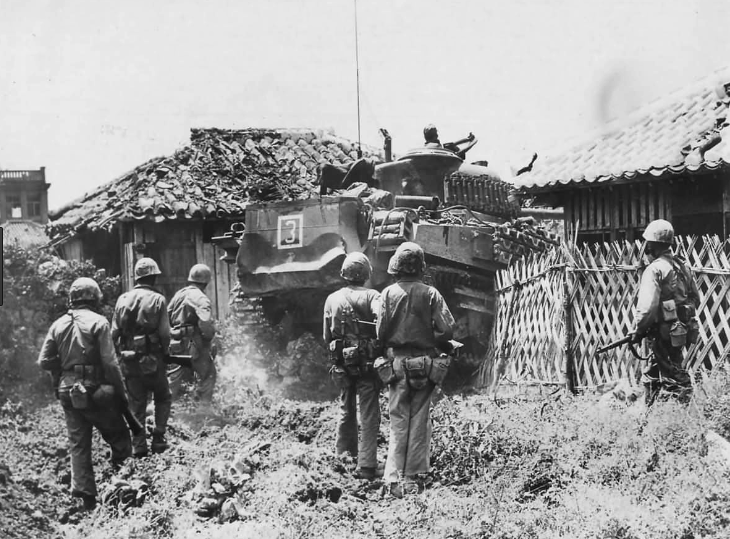 On 13 May, 1945, the 22nd Marines sent a combat reconnaissance patrol into the northern suburbs of Naha. This first patrol was turned back after taking heavy fire from a Japanese fortified area that had been deserted just the day before. In an effort to reduce this outpost an artillery barrage was laid on these newly discovered positions. After the barrage was completed, Company L, 3/22 Marines supported by armor was ordered back into the suburbs to finish destroying the remaining Japanese resistance. One tank was destroyed by a suicide tank hunter with a satchel charge even as the Marine "Grunts" were held up by heavy Japanese MG fire. Unable to continue unassisted, Company K was ordered into Naha.Attacker: American (USMC) (Elements of Companies K & L, 3rd Battalion, 22nd Marines and 6th Tank Battalion)