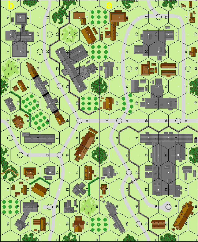 | Remove the word “woods”. The side that moves second starts with 4 VP. No VP are awarded for Kfz1 or Kfz4. All multi-hex buildings are 11/2 levels with inherent stairwells. Ignore the staircase symbols. Also, keep in mind that the victory conditions will require that you be the last side with a Good Order MMC in each location in order to control it. | VFTT08 |