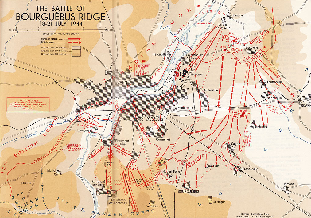 Operation Goodwood was a bloody failure for the Allies. The SS troops atop Bourguebus Ridge had stopped the British attack. Montgomery did not give up his ambitions to destroy the Germans south of Caen. Operation Spring followed up Goodwood and threw the Canadians at the same ridge. Early on July 25, the Canadian infantry advanced straight into the guns of the dug-in Germans.Attacker: Canadian (Elements, 3rd Canadian Infantry Division)