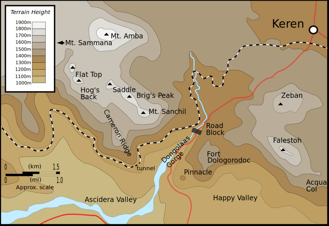 Keren had no built-in fortifications or defensive structures but it is surrounded on most sides by a jumble of steep granite mountains and sharp ridges which gave the defending forces on the high ground a distinct advantage whilst providing their artillery with perfect observation of any attacking formations. The narrow Dongolaas Gorge through which both the road and railway from Agordat to Keren passed was dominated on the south eastern side by the massif of Mount Zeban and Mount Falestoh on which stood the imposing defenses of Fort Dologorodoc. Gaining the fort would not only give the attacking forces the artillery observation post to direct fire on both sides of the gorge but would expose the reverse slopes of the Dologorodoc mass to direct fire from the fort. The Keren defenses had been reinforced with the arrival of 6th Colonial Brigade from Metemma and also the 11th Blackshirt Battalion of the Savoia Grenadiers. The defenders now totalled 25,000 strong facing an attacking force which had grown to more than 13,000. The two offensives were planned to take place one after the other on 15 March so that the full force's artillery could be employed for the preliminary bombardment of them both. At the final meeting on 14 March with his commanders William Platt said: “Do not let anybody think this is going to be a walkover. It is not. It is going to be a bloody battle: a bloody battle against both enemy and ground. It will be won by the side which lasts longest. I know you will last longer than they do. And I promise you I will last longer than my opposite number.” At 07:00 on 15 March, the British and Commonwealth troops of 4th Indian Infantry Division attacked from Cameron Ridge making for Sanchil, Brig's Peak, Hog's Back and the three peaks of Mount Sammana.Attacker: British (4th Indian Division)