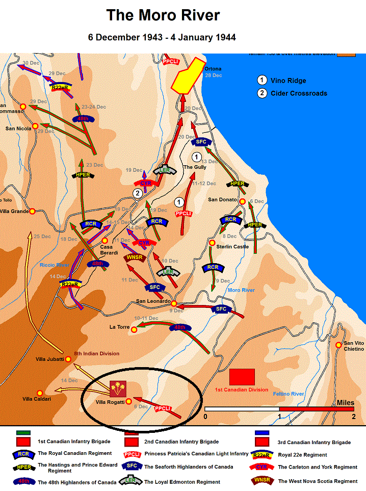 The First Canadian Division commander, Chris Vokes after studying patrol reports decided to establish a bridgehead and chose to cross the Moro at three points. The bridgeheads; on Route 16 near the mouth of the Moro, at San Leonardo and at Villa Rogattia village two miles upstream from San Leonardo. The Hasty Ps were to cross the Moro on the right, while the Seaforth of Canada took San Leonardo in the centre and the PPCLI on the left were to capture the village of Villa Rogatti, two miles upstream from San Leonardo. The only clear-cut success was gained by the PPCLI who had slipped across the Moro at an unguarded ford and by dawn had captured the village in a short but savaged battle. When morning came, the Germans launched their first counter attacks along the Moro producing mixed results, and still unable to dislodge Major W.D. "Bucko" Watson and his company as they stood firm on the north bank...Attacker: German (Elements PanzerGrenadier Regiment 200)