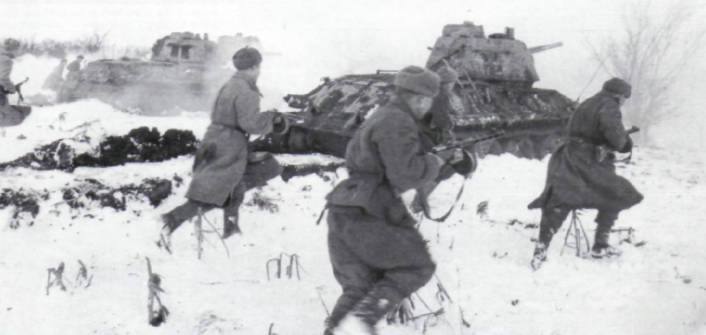 The Neva River had been frozen since 7th January. The Russians unleashed from 4500 barrels a hurricane of fire over the German positions. The shell burst and heavy mortar fire was reinforced with the weight of the Red Fleet in the Leningrad harbour. Then across the perfectly flat, snow-covered ice of the Neva, charged in close line abreast, the men of the Soviet 13th Rifle Division. Their objective was the hospital in Gorodok where Leutnant Winacker had set up his command post of his 2nd Company, Engineer Battalion 240, transforming the smoldering block of buildings into a spitfire fortress…Attacker: Russian (Soviet 13th Rifle Division / 61st Tank Brigade / Red Banner Baltic Fleet)