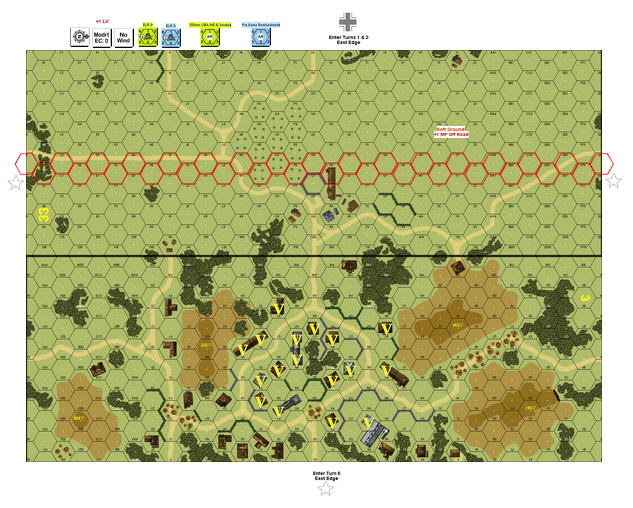 | Misc Rules: | Pre-Game Bombardment. Soft Ground (+1 MP off road) |
