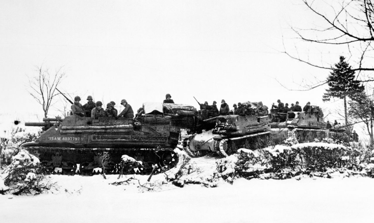 American tanks and armored gun carriers drive over snow-covered terrain towards Samree, Belgium