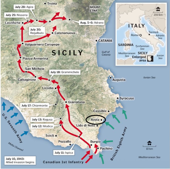 Avola was the objective of the British 50th Division, which was landing by sea to the south. However, a small group of American paratroopers, who had been dropped north of town by mistake, decided to attack. Apparently it didn’t occur to them that taking a town of 22,000 would be tough with only 75 men. By mid-afternoon, the attack had stalled and they were pinned down by machine gun fire. Suddenly, a Bren carrier appeared and blasted the position. . . .The following day, a carrier pigeon bearing a message from the Italian 206th Coastal Division was intercepted. Part of the message read: “Heroic infantry and artillery still doing their duty . . . Send more pigeons.”Attacker: American / British (505th Parachute Regiment, 82 Airborne / 50th Northumbrian Division)