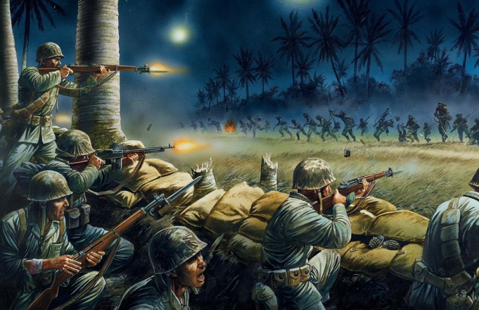The 2nd Division under General Sendai launched its belated attack on the Marine lines in the area near Edson's Ridge around midnight, soon after a torrential downpour began. The rain cut down on the attack's coordination. During the remainder of the night repeated probes and charges were made, foring “Chesty” Puller to call upon his reserves and use the 164th Infantry Regiment to plug growing gaps in his line, where the 1st Battalion of the 29th Infantry were attacking.Attacker: Japanese (29th Infantry Sendai's 2nd Division)