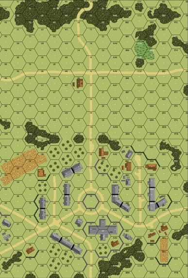 The German 5th Panzer Division, under the command of Rommel, was attacking the British east of the La Basee Canal. The 2nd Battalion of the Dorsetshire Regiment pulled back from the village of Gorre and set up their defenses in the town of Festubert. “D” Company was in the northern end of town. A few stragglers from the battalion’s armored transport had returned to Festubert after a German tank platoon had smashed the fleeing British column. Following up the few vehicles which had managed to return to the perimeter, the panzers appeared on the northern outskirts of the village. . .Attacker: German (5th Panzer Division)