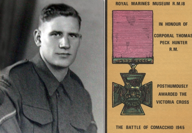 Elements of the 2nd Commando Brigade had crossed Lake Comacchio. C Troop of #43 Commando had the mission of clearing the Germans form a group of houses near the Canal on Objective Exodus. As C Troop approached Exodus it came under a torrent of machinegun fire from the defending 42nd Jaeger Division. Stopped in its tracks, C Troop was in danger of annihilation. Then Corporal Hunter took the Bren gun from his section and charged alone across 200 yards of open ground. . .Attacker: British (C Troop, 43 Commando, 2nd Commando Brigade)