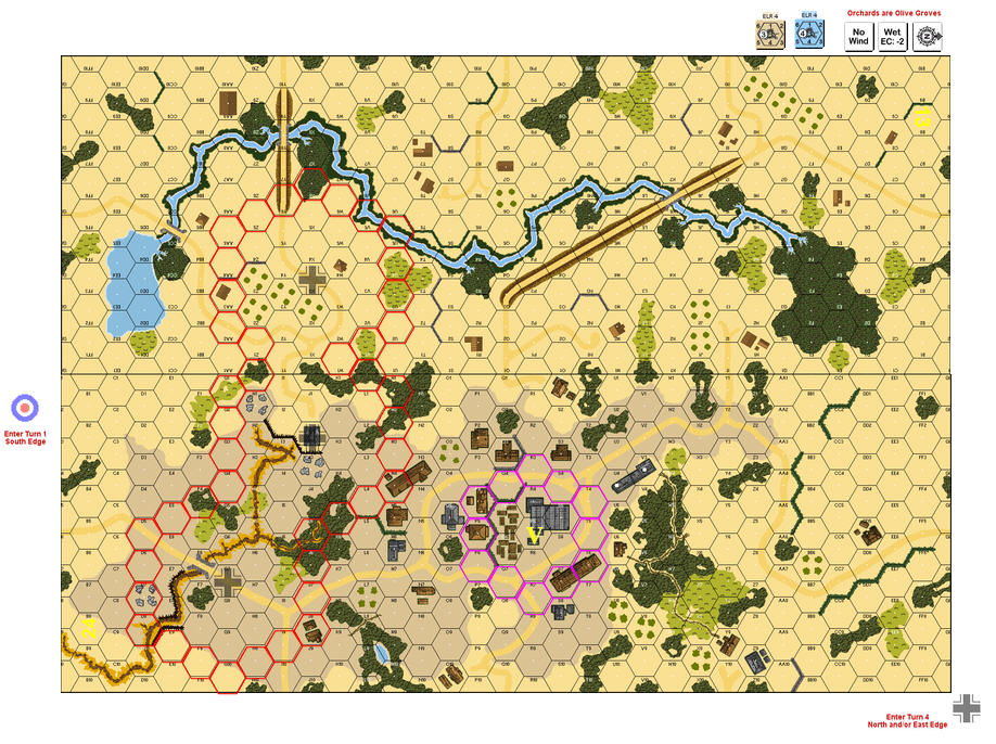 | Misc Rules: | Olive Groves (B14.8) A: Ammo Shortage (A19.131) starting Turn 6, 10-3 Leader Heroic |