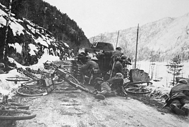 "Operation on the Gudbrandsdal" -- After landing in Norway, the 148th British Territorial Brigade’s most serious threat was coming from the south, where the Germans, halted 10 days before in Oslo, were pushing back the Norwegian 2nd Division along the railway and the Gudbrandsdal river. The British were heavily handicapped by the Cedarbank torpedoing, which sank the entire Brigade transportation pool along with the majority of its ammunition and food reserves. Finally, a strong defensive position was installed at Tretten. Despite the support of some surviving Norwegian units, things were not looking good. Without artillery support and short of ammunition, the British soldiers hadn’t slept and had barely eaten during the last thirty-six hours.Attacker: German (196th Infantry Division)