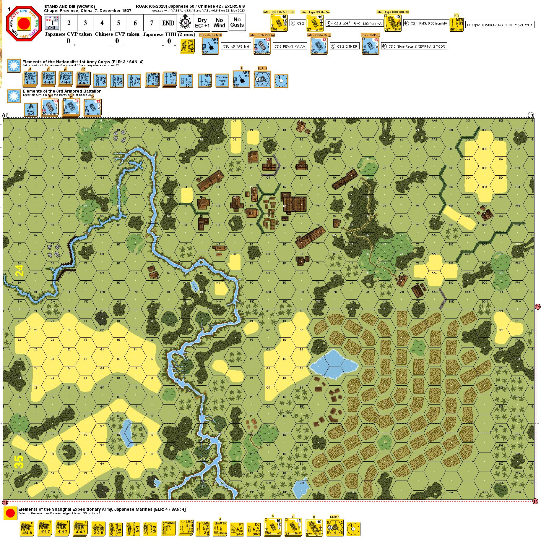 | 2023-11-19 | (D) John Gorkowski | vs | Neil S | | Japanese win | | The title is false advertising. My opponent (the Japanese) may have discovered a flaw in this scenario that deflated the fun factor for both of us. Since this is pre-1938 (December 1937), No Quarter (G18.7) is NOT in effect and Chinese KMT troops can surrender. Given double CVP for captured units, the Japanese have more incentive to capture Chinese squads (4 CVP each) than buildings, one prisoner squad is worth as much as 4-hex building! Similarly, the Chinese gun and AFV are each a CVP bonanza if captured. So, the Japanese need not banzai, but rather just use their MMGs, mortars, and AFV to gang up on one squad per turn to reap huge CVP rewards via capture without any need for substantial territorial gains. The scenario also has some historicity issues worth noting.