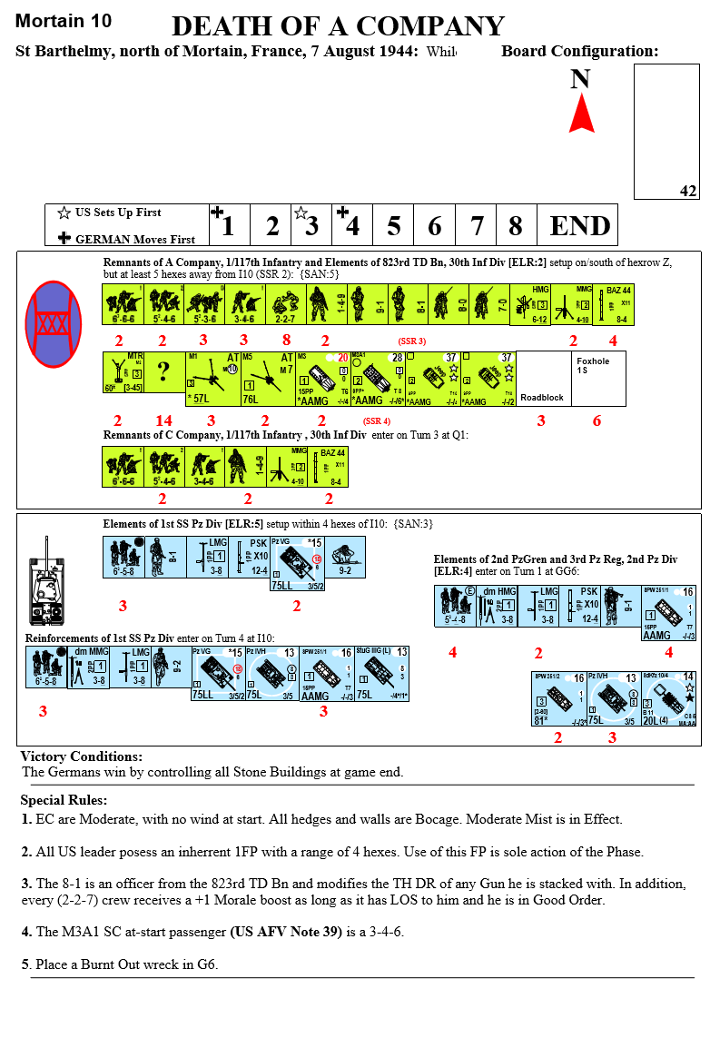 The 1st Battalion of the 117th Infantry Regiment have been assigned to the small crossroad village of St Barthelemy just north of Mortain. As darkness falls a platoon from the 823rd Tank Destroyer Battalion arrives to reinforce the defenses. The night is relatively uneventful, but during the morning hours a thick fog has enveloped the area reducing visibility dramatically. After some delay around Mortain elements of the 2. Panzerdivision and 1. SS-Panzerdivision were now available to attack through St. Barthelemy and continue the thrust on to AvranchesAttacker: German (SS) (Elements of the 1st SS Panzer Division and 2nd Panzergrenadier Regiment and 3rd Panzer Regiment, 2nd Panzer Division)