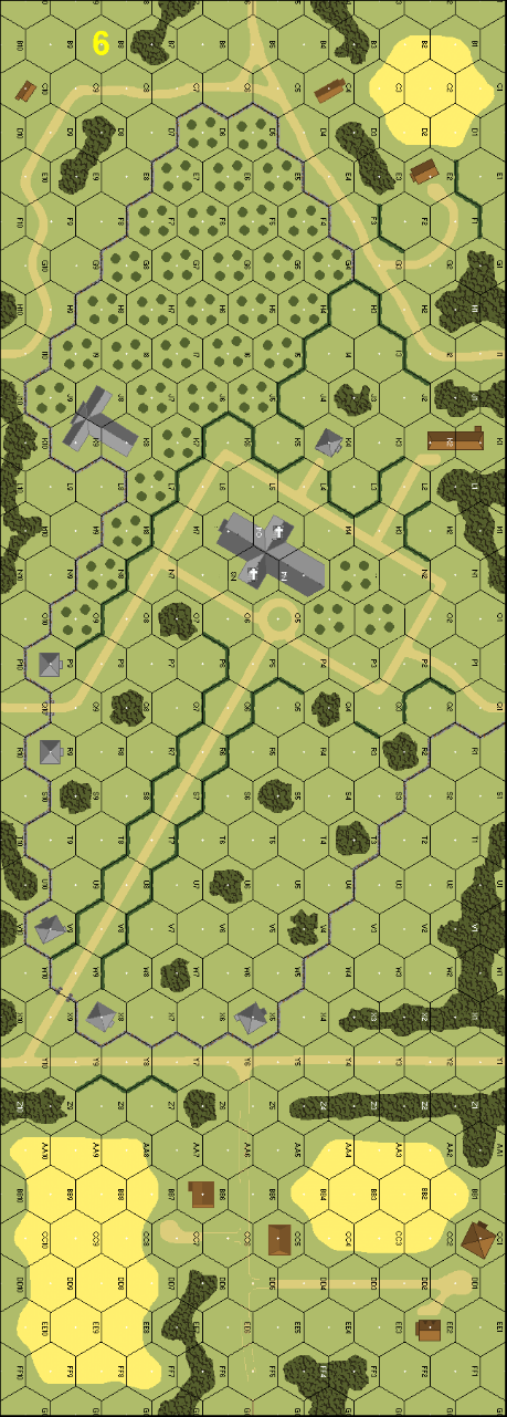 On the 8th of July, Montgomery launched Operation CHARNWOOD which was to clear Caen as far as the Orne River, and then establish bridgeheads across the river. Major General Keller’s 3rd Canadian Infantry Brigade would attack the Ardennes Abbey. The abbey was being used as a forward command post by SS commanders. With thick stone walls, two church towers and further walls surrounding a large orchard, it made an ideal headquarters location from which to control the forthcoming battles around Caen.. . .Elements of the Canadian Regina Rifles are launching an assault on the Abbey and its defenders elements of a regimental headquarters of the HitlerJügend division. Nine and a half 458’s with four leaders and an assortment of support weapons must overcome three 447’s and an 8-1 in the Board 6 chateau (shrunk to four hexes). Sounds like a cakewalk for the Canadians except that on turn two, six 658s and two Panzer. IV’s of the Adolf Hitler Division appear.Attacker: Canadian (Elements Regina Rifles, Canadian 7th Brigade)