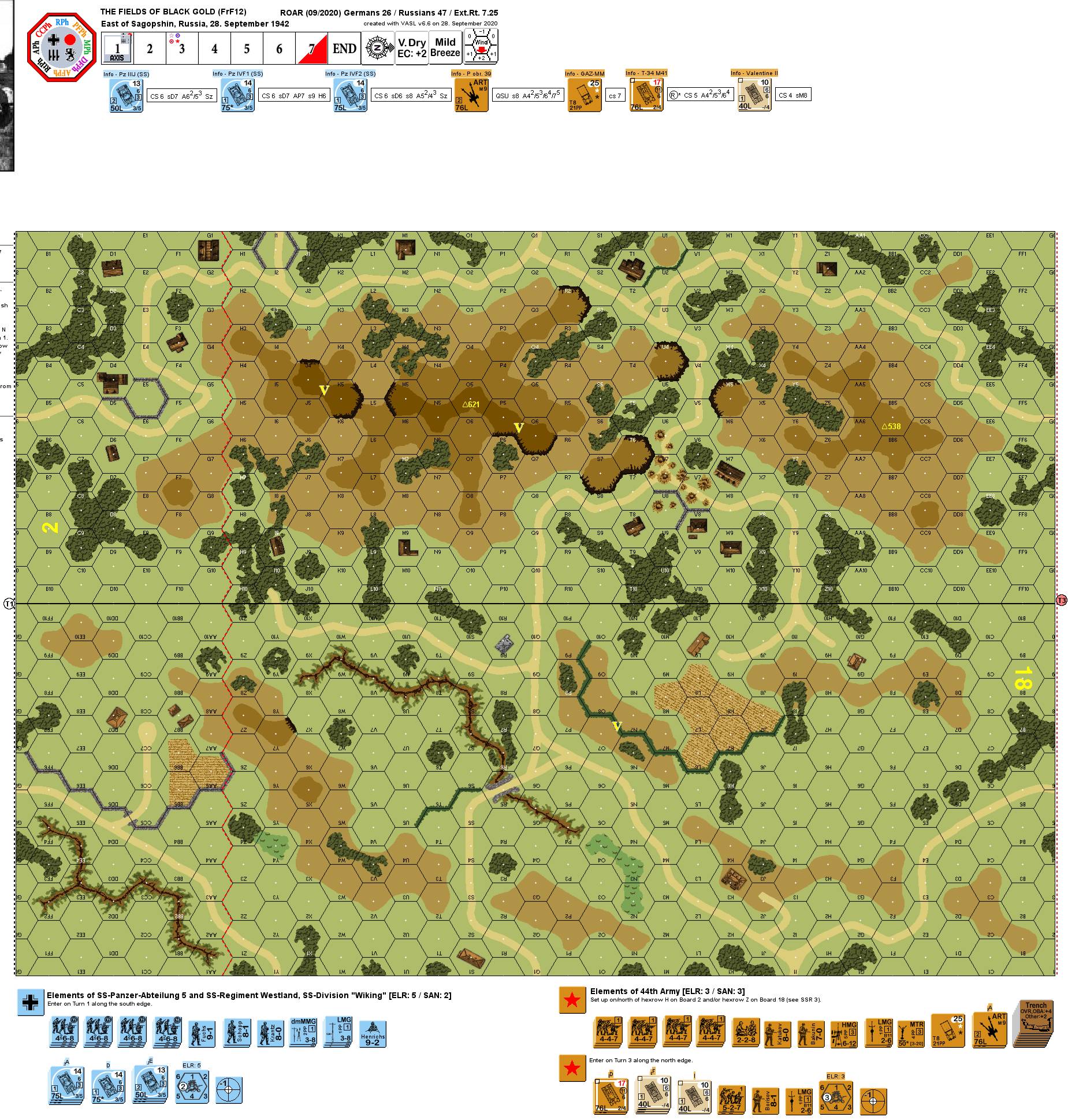 In mid-September, after the fall of Rostov, the Wiking SS Division received orders to leave the western Caucasus and move eastward in order to spearhead the attack on the important oil fields east of Grozny. After two days of bitter fighting against deep and well-fortified Russian defenses, the Germans reached Sagopshin and made preparations for assaulting the town. - - - - In The Fields of Black Gold a company of SS infantry reinforced with Panzer IIIs and IVs surprise the Russian defenders, whose plan for the day didn't include fending off a strong German attack, but rather finishing the trenches and positioning the last guns.Attacker: German (SS) (SS-Panzer-Abeilung 5 and SS-Regiment Westland, SS-Division Wiking)