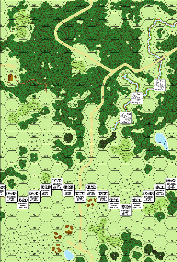 | Misc Rules: | PTO, LJ (Exc: roads exist), Wire hexes also hv 6 factor AP minefields. |