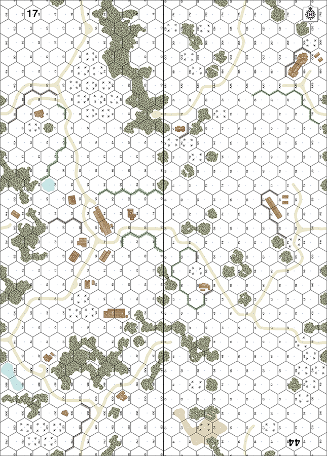 | Misc Rules: | GS (E3.72), DS (E3.73). All roads dirt. Bldgs: Wooden. A: AS (A19.131), EW (E3.74). |