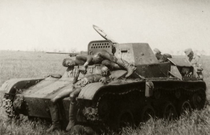 Dead Soviet crew lay on their knocked-out T-60