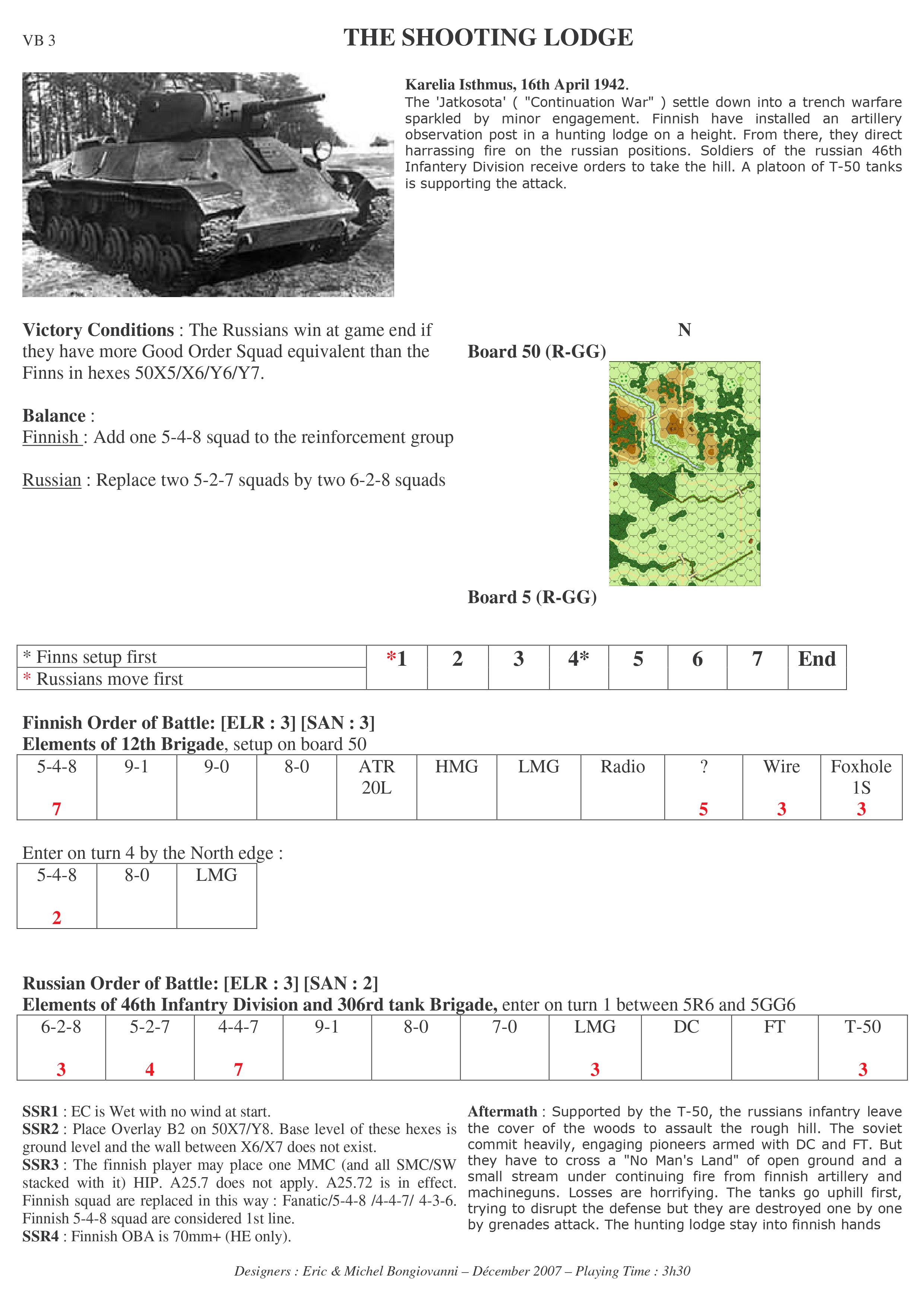 The ‘Jatkosota’ settled down into trench warfare, sparkled by minor engagement. The Finns had installed an artillery observation post in a hunting lodge on a height. From there, they directed harrassing fire on the Russian positions. Soldiers of the Russian 46th Infantry Division received orders to take the hill. A platoon of T-50 tanks supported the attack. . .Attacker: Russian (46th Infantry Division and 306th Tank Brigade)