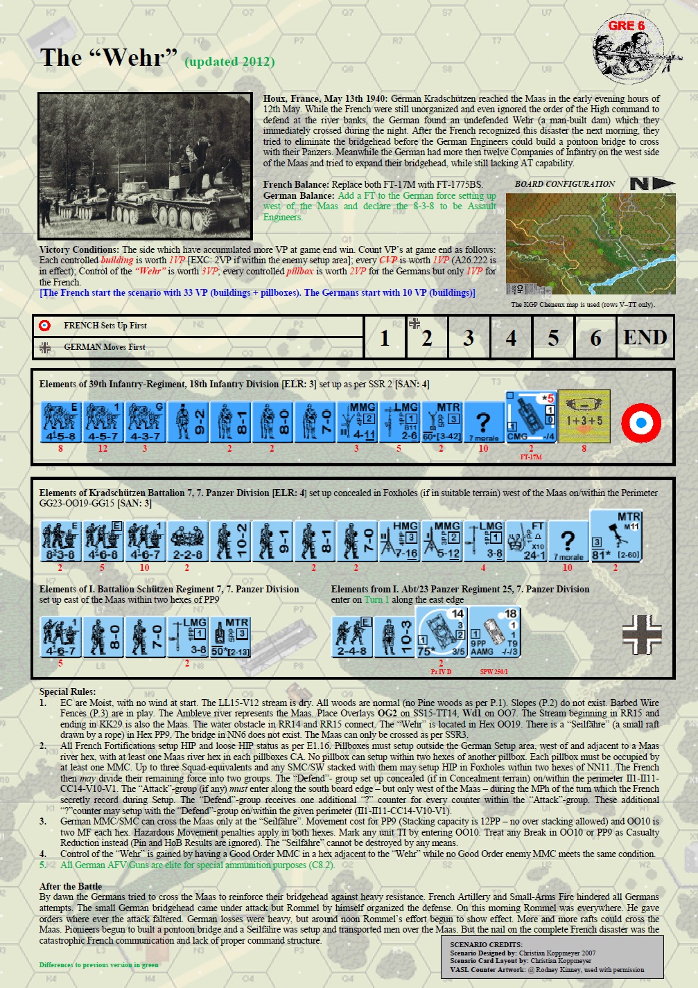 German Kradschützen reached the Maas in the early evening hours of 12th May. While the French were still unorganized and even ignored the order of the High Command to defend at the river banks, the German found an undefended Wehr (a man-built dam) which they immediately crossed during the night. After the French recognized this disaster the next morning, they tried to eliminate the bridgehead before the German engineers could build a pontoon bridge to cross with their panzers. Meanwhile, the German had more then twelve companies of infantry on the west side of the Maas and tried to expand their bridgehead, while still lacking A-T capability.Attacker: German (7. Panzer Division)