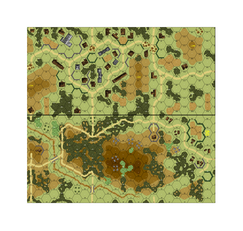 | Misc Rules: | Stream is Dry, ground level bldgs. NQ. A: Turn 6 and beyond, DR for each vehicle: 12 immobilizes |