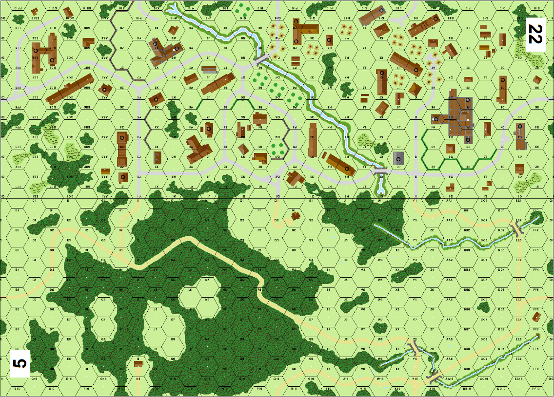 | Misc Rules: | Bldgs: Wooden, Gullies: Streams, Rubble/shellholes added. |