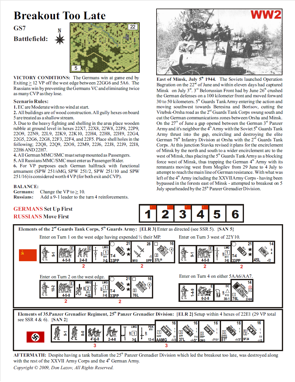 | AFVs: A:4 SU-76M x 2 M4/76(a) ZSU-37 ZIS-5 x 5 Motorcycle x 2 |