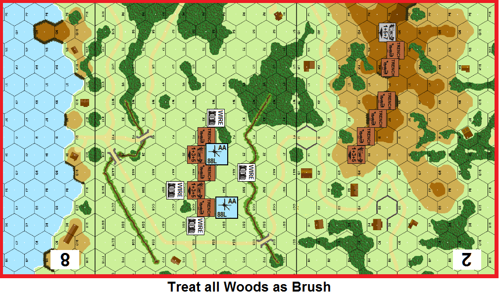 | Misc Rules: | Woods: Brush. D: AE (H1.22), A: Pillboxes are rally terrain |