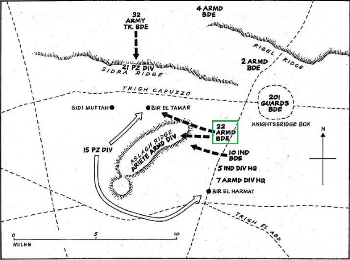 While the 150th Brigade was being destroyed by essentially the entire Afrika Korps, little action of any kind was taken by the strong British armored units pinning the Germans and Italians into the Cauldron. An ambitious offensive, however, was being planned by the British high command, who deemed it "Aberdeen". This operation consisted of a massive frontal assault directly into the Cauldron area, using a night infantry attack followed closely by armor, both with heavy artillery support. The 22nd Armoured Brigade was to dive through the center of the Axis line held by Ariete, then swing north to take the Afrika Korps from the rear.Attacker: British (22nd Armoured Brigade)
