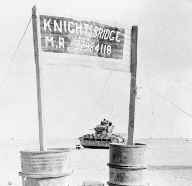 British Matilda tank passes the 'Knightsbridge' road junction shortly after the major tank battle there.