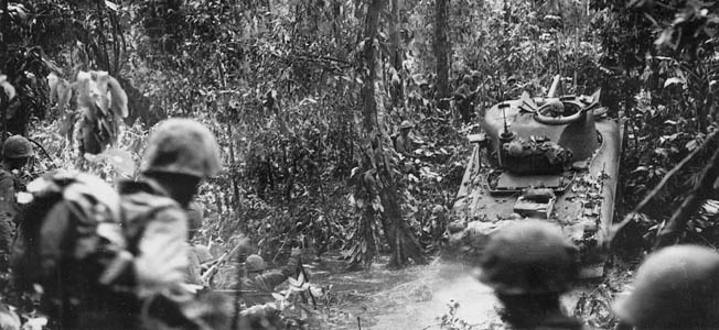 In the Battle of Suicide Creek, the Marines moved tanks up though the jungle but could not get them across a high-banked creek - until Kerry L. Lane manned a bulldozer and, under intense fire and totally exposed to the enemy, dumped enough landfill into the surging stream to allow the tanks to cross. Lane was shot in the shoulder, but refused to leave the battlefield. Using a telephone, he directed the driver of the lead tank around obstacles as it moved forward. The Japanese eventually retreated. Lane earned a Purple Heart, a Silver Star, five combat stars, a presidential citation for gallantry, and the rank of staff sergeant.Attacker: American (USMC) (2nd and 3rd Battalions, 7th Marine Regiment and 1st Pioneer Battalion/1st Tank Battalion and 1st Pioneer Battalion)