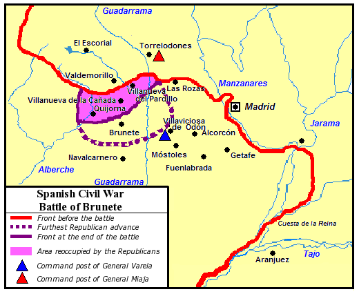 The Republicans had decided to clear the Brunete area juts 20 km west of Madrid, using every available (Russian supplied) tank and plane to support a showpiece offensive by the Communist Party’s troops. The attack began at dawn on July 6th, and despite initial success on the first morning, command failure became evident when the leading divisions halted indecisively because follow-up units had not cleared bypassed villages. At Villanueva, despite the presence of many Republican tanks, machine-gun fire from the church tower and other buildings had mown down the ranks of struggling 34th Division infantry. When the spent unit pulled back from the town, dazed with thirst and fatigue, the XVth International Brigade’s British and American battalions were committee to take over the attack.Attacker: Republican (British Battalion, XV International Brigade)